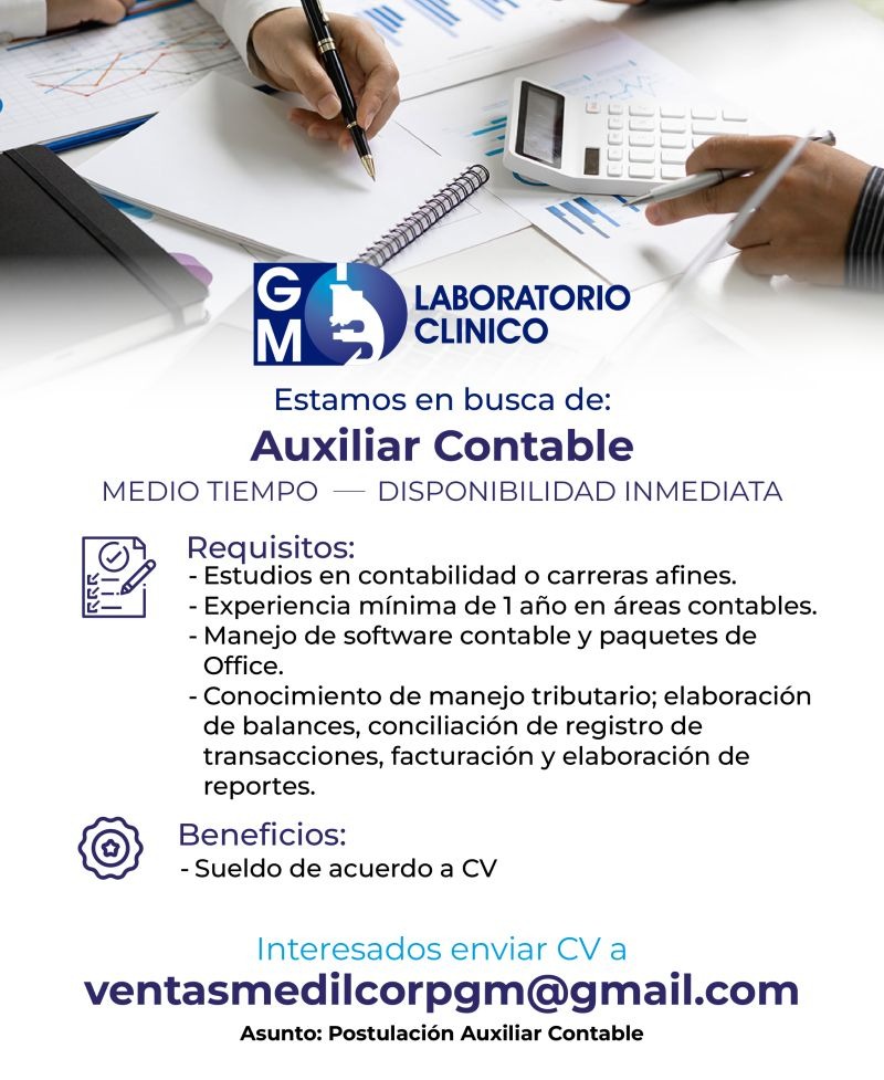 🔸 𝗥𝗲𝗾𝘂𝗶𝘀𝗶𝘁𝗼𝘀: Contador/a con 1 año de experiencia. 𝗔𝗽𝗹𝗶𝗰𝗮 𝗲𝗻/𝗮𝗹 𝗰𝗼𝗿𝗿𝗲𝗼: VENTASMEDILCORPGM@GMAIL.COM. Asunto: AUXILIAR CONTABLE. Residir en Cuenca y tener disponibilidad inmediata.