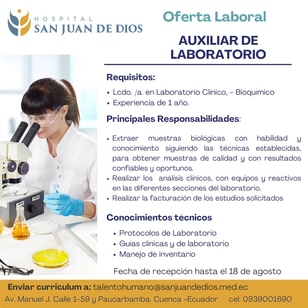 🔸 𝗥𝗲𝗾𝘂𝗶𝘀𝗶𝘁𝗼𝘀: Licenciatura en Laboratorio Clínico o Bioquímica con 1 año de experiencia. 𝗔𝗽𝗹𝗶𝗰𝗮 𝗲𝗻/𝗮𝗹 𝗰𝗼𝗿𝗿𝗲𝗼: TALENTOHUMANO@SANJUANDEDIOS.MED.EC. Asunto: Auxiliar de Laboratorio. Residir en Cuenca y tener disponibilidad inmediata.