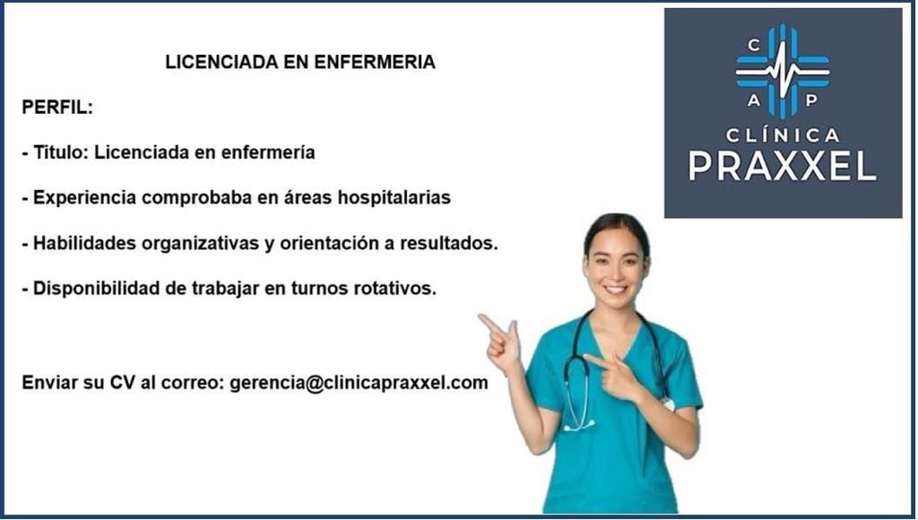 🔸 𝗥𝗲𝗾𝘂𝗶𝘀𝗶𝘁𝗼𝘀: Licenciada en Enfermería. 𝗔𝗽𝗹𝗶𝗰𝗮 𝗲𝗻/𝗮𝗹 𝗰𝗼𝗿𝗿𝗲𝗼: GERENCIA@CLINICAPRAXXEL.COM. Asunto: LICENCIADA EN ENFERMERÍA. Residir en Cuenca y tener disponibilidad inmediat.