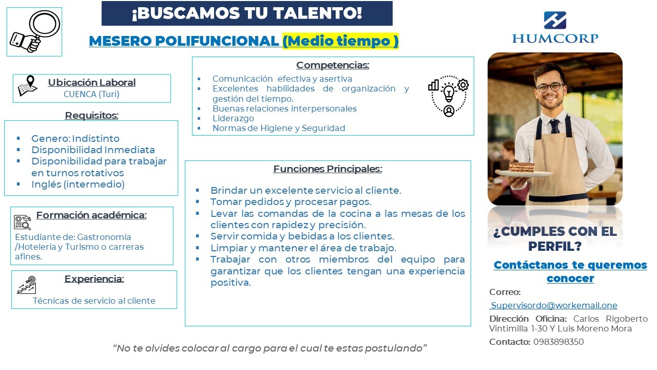 🔸 𝗥𝗲𝗾𝘂𝗶𝘀𝗶𝘁𝗼𝘀: Técnicas de servicio al cliente. 𝗔𝗽𝗹𝗶𝗰𝗮 𝗲𝗻/𝗮𝗹 𝗰𝗼𝗿𝗿𝗲𝗼: SUPERVISORDO@WORKEMAIL.ONE. Asunto: MESERO POLIFUNCIONAL. Residir en Cuenca y tener disponibilidad inmediata.